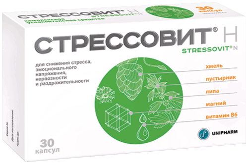 СТРЕССОВИТ® Н — комплекс магния, флавоноидов (экстракт хмеля, липы, пустырника), витамина В6, обладающий мягким успокоительным действием.