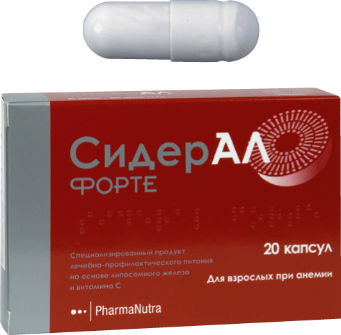 СидерАЛ Форте является специализированным продуктом лечебно-профилактического питания на основе комбинации липосомного железа и витамина С.