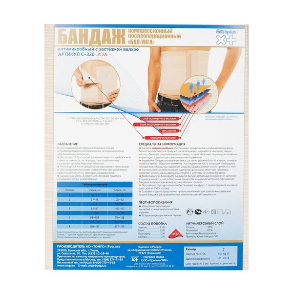 Бандаж послеоперационный БКПА УНГА артикул С-320 применяется сразу после операций на брюшной полости и брюшной стенке, области почек, а также после Кесарева сечения. Вставка из ткани с антимикробной пропиткой дополнительно обеспечивают профилактику вторичного инфицирования. Вставка с антимикробной пропиткой является неотделимой часть изделия и может подвергаться многократной стирке и стерилизации.