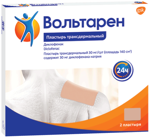 Абсорбция и распределение в организме: Количество диклофенака, абсорбируемое системно из пластыря Вольтарен® в течение 24 ч сходно с таковым при применении эквивалентного количества Вольтарен® Эмульгел®я (гель для наружного применения 1%). 99,7% диклофенака связывается с сывороточными белками, в основном — с альбумином (99,4%).