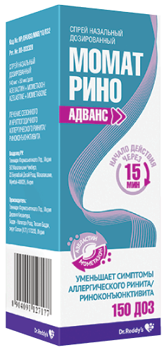 Препарат МОМАТ РИНО АДВАНС содержит два действующих вещества, азеластина гидрохлорид и мометазона фуроат, с разными механизмами действия. Уменьшение симптомов аллергического ринита отмечается через 15 мин после применения и продолжается до 12 ч и более.