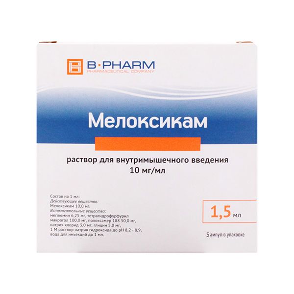 Мелоксикам полностью абсорбируется после внутримышечного введения. Относительная биодоступность по сравнению с биодоступностью при приеме внутрь составляет почти 100%. Поэтому при переходе с инъекционной на пероральные формы подбора дозы не требуется. После введения 15 мг препарата внутримышечно пиковая концентрация в плазме, составляющая около 1,6–1,8 мкг/мл, достигается в течение приблизительно 60–96 мин.