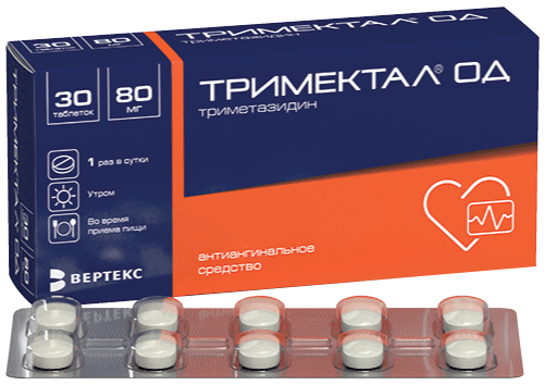 В исследовании с участием 1962 пациентов со стабильной стенокардией триметазидин в двух дозировках (70 и 140 мг/сут) в сравнении с плацебо был добавлен к терапии атенололом 50 мг/сут. В общей популяции, включая пациентов как без симптомов, так и с симптомами стенокардии, триметазидин не продемонстрировал преимуществ по эргометрическим и клиническим конечным точкам. Однако в ретроспективном анализе в подгруппе пациентов с симптомами стенокардии триметазидин (140 мг) значительно улучшил общее время нагрузочного теста и время до развития приступа стенокардии.