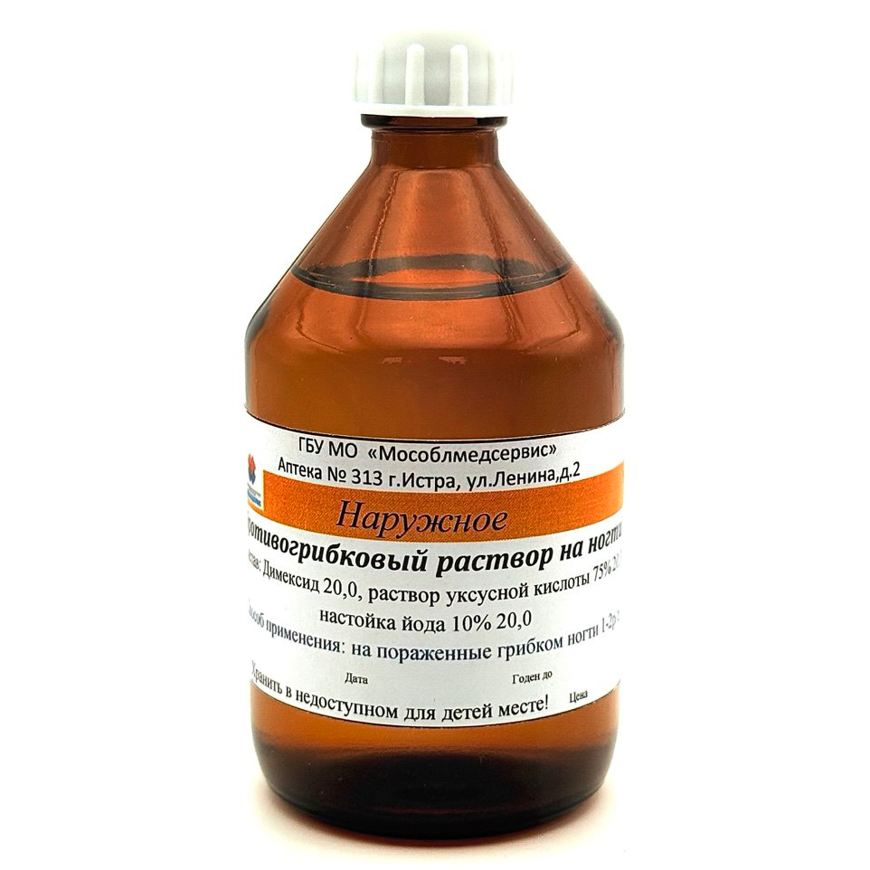 Димексид 20.0, раствор уксусной кислоты 75% 20.0, настойка йода 10% 20.0